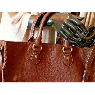 Inicio > vestir > Extrañar > Gucci STRUZZO Ostrich Leather Travel Tote Brass CAT Crossbody Messenger Size XL