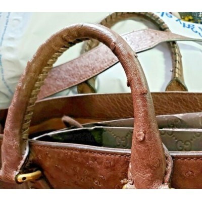 Gucci STRUZZO Ostrich Leather Travel Tote Brass CAT Crossbody Messenger Size XL